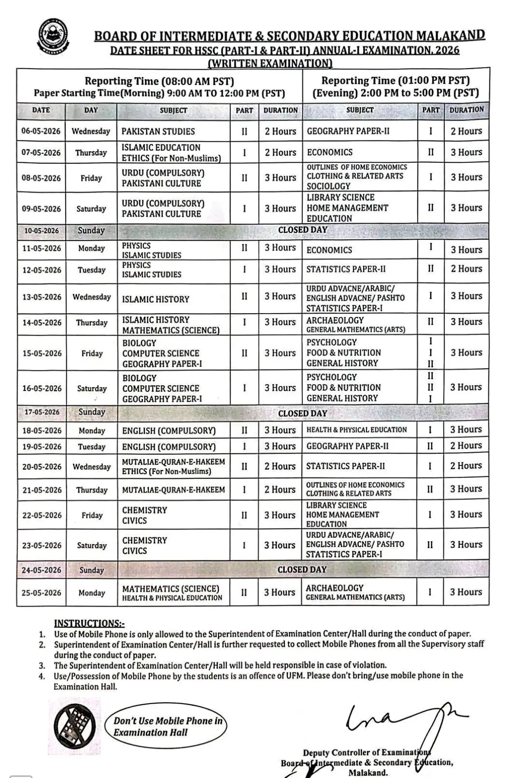BISE Malakand has issued HSSC I II Datesheet