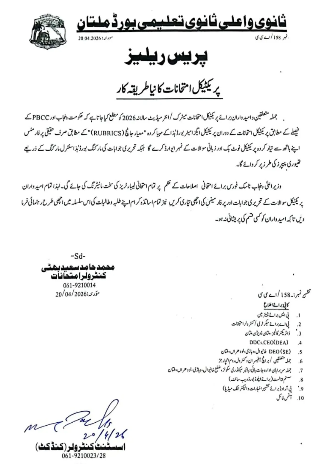 This Press Release from BISE Multan titled "BISE Multan Paractical Papers New Rules" contains important information. View the full document for complete details.