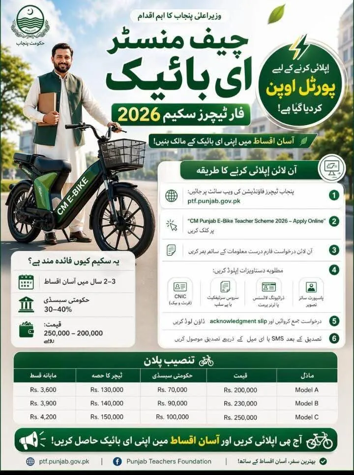 The application process is simple and fully online. Interested teachers need to visit the official website ptf.punjab.gov.pk and click on the “CM Punjab E-Bike Teacher Scheme 2026 – Apply Online” option. Applicants are required to fill out the online form with accurate information.