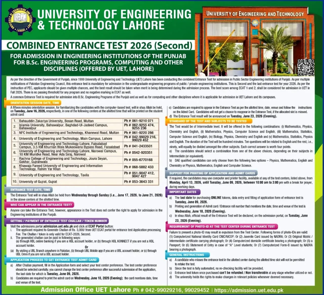 *یونیورسٹی آف انجینئرنگ اینڈ ٹیکنالوجی لاہور نے پنجاب کی تمام سرکاری و نجی انجینئرنگ یونیورسٹیوں میں داخلوں کے لیے کمبائنڈ انٹری ٹیسٹ (ECAT) 2026 (سیکنڈ) کا باقاعدہ اعلان کر دیا ہے۔*