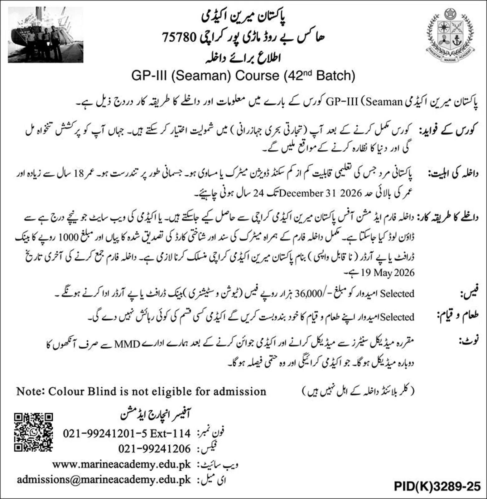 *`پاکستان میرین اکیڈمی میں GP-III Seaman کورس کے داخلوں کا اعلان`*